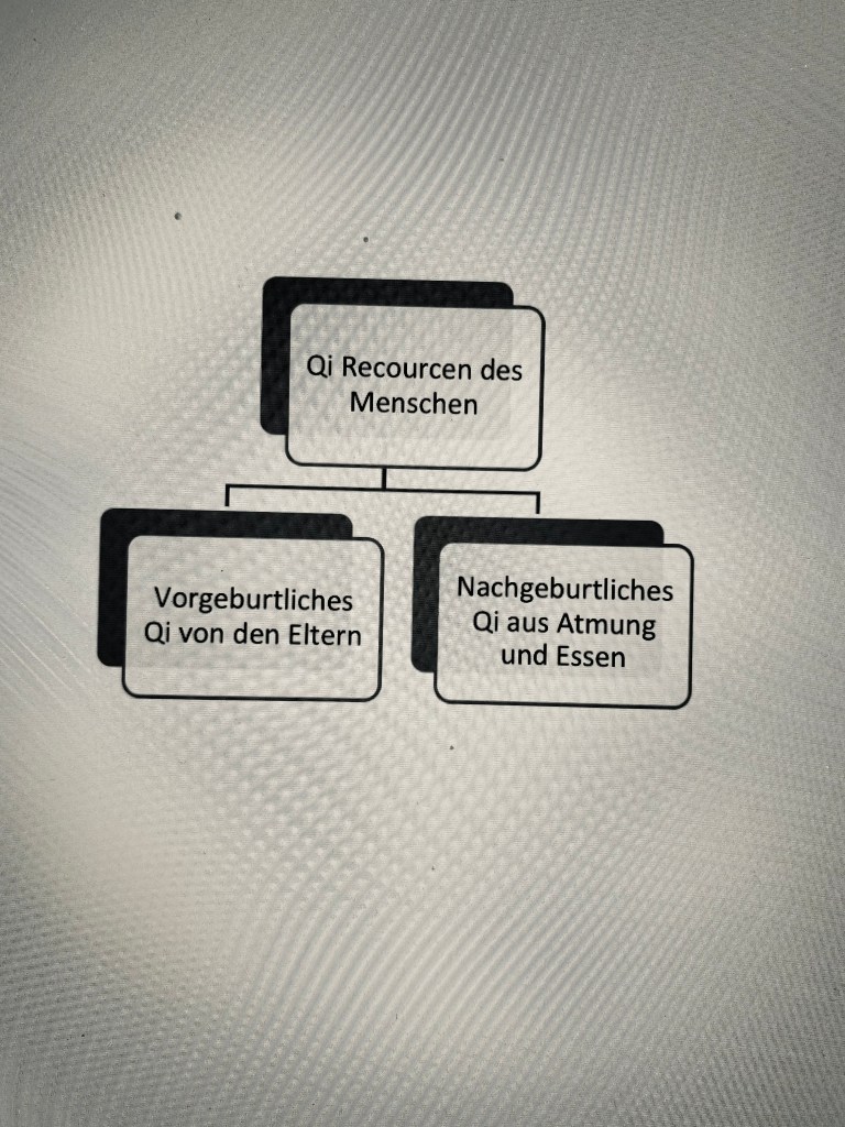 Durch seine Funktion wird das Qi beschrieben es ist also keine fixierte Begrifflichkeit. Je nachdem was damit beschreiben möchte kann man dies durch ein zusätzliche Ausdrücke/ Namen definieren. Nehmen wir zum Beispiel die Organe so hat jedes Organ seine eigene Definition an Qi, z.B. der Magen hat Magen Qi und dies ist für die Verdauung und Weitertransport der Nahrung, die Niere hat Nieren Qi zuständig für die Funktion des filterns, Herz Qi ist für das aufrecht erhalten des Herzschlages, us.w.. Bevor das Qi jedoch in zu so kleine Einheiten zerstückelt wurde kam es aus den größeren Qi Einheiten.